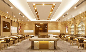 珠寶店屬于奢侈品展示,裝飾設計必需體現其高貴的特性。要對商品價值、尺度、顏色、文化內涵和精神品質,以及消費者的年齡層次、經濟水平進行綜合把握,實現人與商品和環境三者的和諧統一。