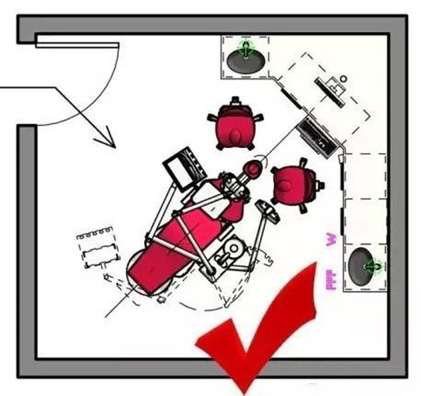 關于牙椅設備的擺放原則一是 病人進入診室,坐上牙椅的路程最短為佳,二是盡量避免患者腳端直接對著門的方向,病人隱私差,不安情緒強。如下圖: